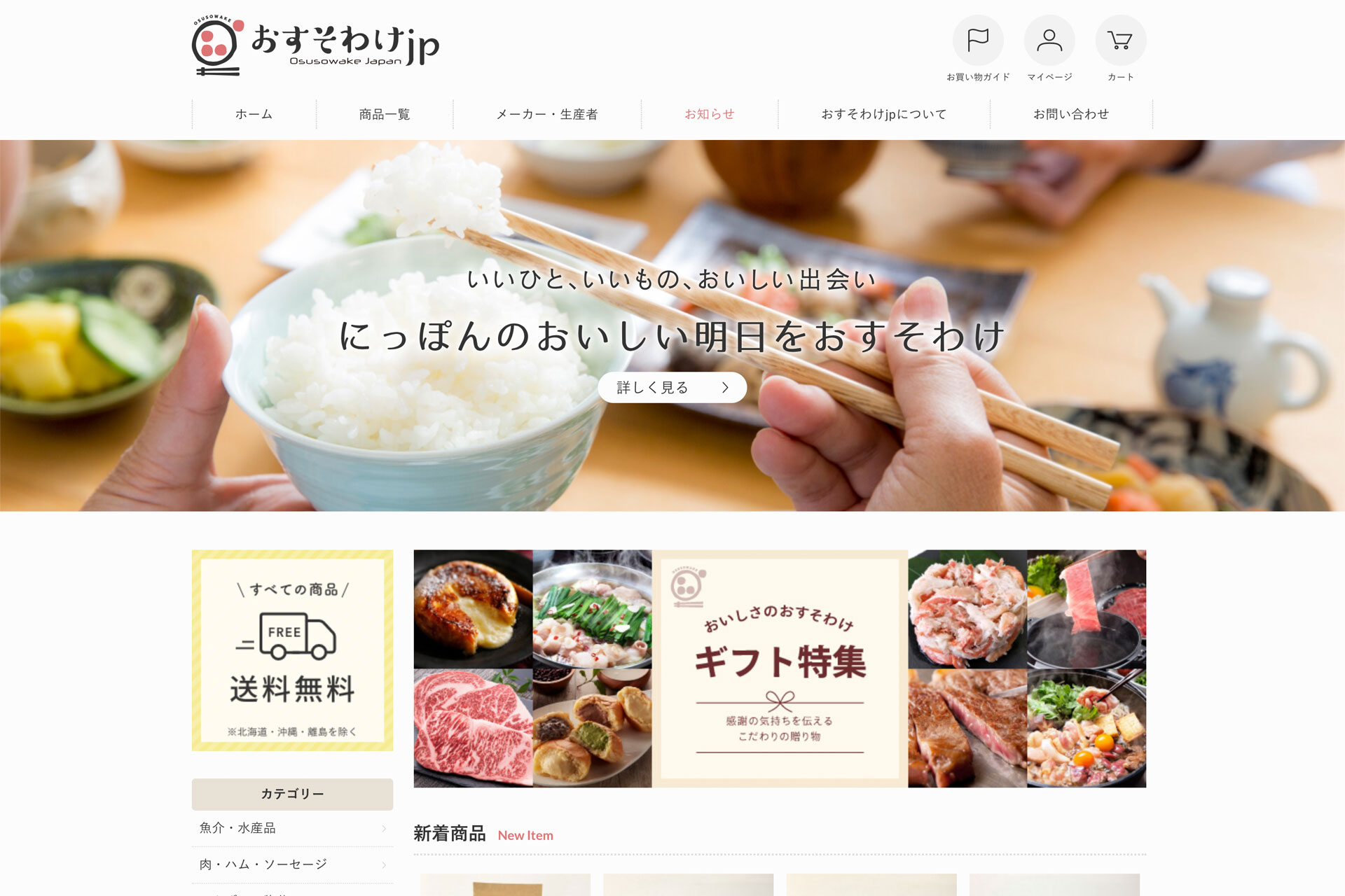 WORK カタチになったこと 開設支援!「おすそわけjp」日本食糧新聞社様 2020.10.01 日本食糧新聞社様が運営する「おすそわけjp」が、2020年10月1日に開設されました。 地方にしかない食品を生産者の想いと一緒に全国へ届ける産直型のオンラインショッピングモールです。 食材の紹介だけでなく、おすそわけjpが現地で取材をし、生産者の物語(こちら)もご紹介しています。 離島の”おいしいおすそわけ”、ぜひご覧ください。